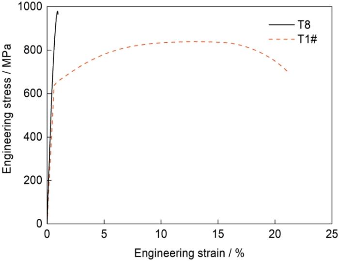 通过显微硬度测量对比了T8原始钢和形变球化后T1#~T4#钢的硬度,分别为(286 ± 2)、(308 ± 2)、(298 ± 1)、(305 ± 2)和(280 ± 3) HV。可见,采用锻后水冷和球化后水冷的T1#钢能够获得较高的硬度,由前文的组织转变过程分析可知,T1#钢组织为回火索氏体,具有较优的强韧性能。因此,优选出硬度最高的T1#钢与原始钢对比,评价其综合性能。