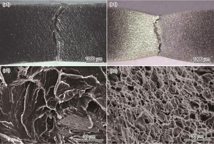 Tensile morphologies (a1, b1) and SEM images of fracture morphologies (a2, b2) of T8 steel (a1, a2) and T1# steel (b1, b2)