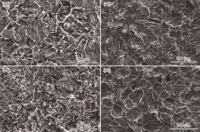 采用配备电子背散射衍射(EBSD)探头的Apreo场发射扫描电子显微镜(FESEM)观察形变球化工艺处理前后2种钢的晶粒尺寸和晶界特征分布。选取尺寸为10 mm × 10 mm × 2 mm的样品作为EBSD试样。先用水磨SiC砂纸逐级打磨到2000号并用颗粒度为2.5 μm的金刚石膏进行抛光,然后使用SiO2抛光液在VibroMet 2振动抛光机上进行振动抛光。采用OIM软件解析EBSD数据。