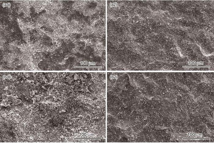 SEM surface corrosion images of T1# steel after immersion for 120 h (a1, a2) and 216 h (b1, b2) before (a1, b1) and after (a2, b2) rust removal
