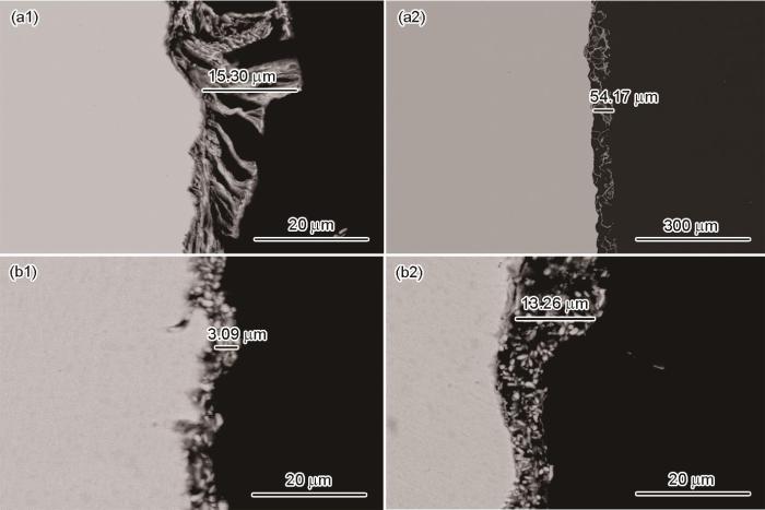 图12为T8钢和T1#钢浸泡120和216 h后截面腐蚀形貌的SEM像。可见,对于T8钢,如图12a1和a2所示,表面累积渗碳体与基体中渗碳体形貌一致,为大片层状,由于渗碳体片层间的铁素体溶解,残留渗碳体片层坍塌后合并在一起,且残留渗碳体厚度随浸泡时间延长而增厚(由浸泡120 h的15.30 μm增加至浸泡216 h的54.17 μm)。然而,相比于T8钢,T1#钢表面累积渗碳体的厚度明显减小(由浸泡120 h的3.09 μm增加至浸泡216 h的13.26 μm),且颗粒之间呈松散态分布,说明粒状渗碳体更容易脱落,如图12b1和b2所示。这主要与2种钢的渗碳体形貌、晶粒尺寸和分布存在差异有关。由于T8钢中的渗碳体呈较大尺寸的片层状,且相邻晶粒间的渗碳体片层相接触,形成网格状结构,很难在腐蚀过程中从表面脱落;表面累积的渗碳体增厚较快,使阴极渗碳体相对面积明显增大,对微电偶效应会起到促进作用。形变球化处理后的T1#钢中渗碳体呈细小颗粒状弥散分布在基体中,因此随基体铁素体的溶解,大部分渗碳体颗粒都脱离表面进入溶液中,仅有少量吸附于表面,有利于减弱微电偶的加速腐蚀作用。