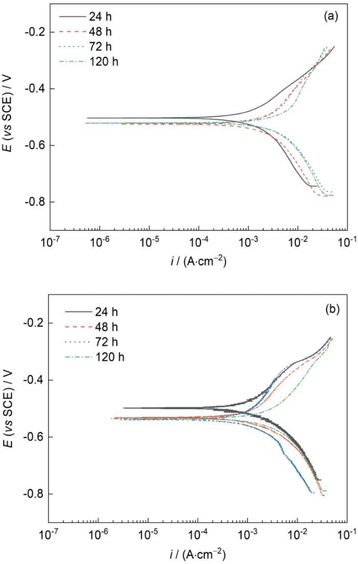 Potentiodynamic polarization curves of T8 steel (a) and T1# steel (b) after immersion for different time (E—potential, i—current density, SCE—saturated calomel electrode)