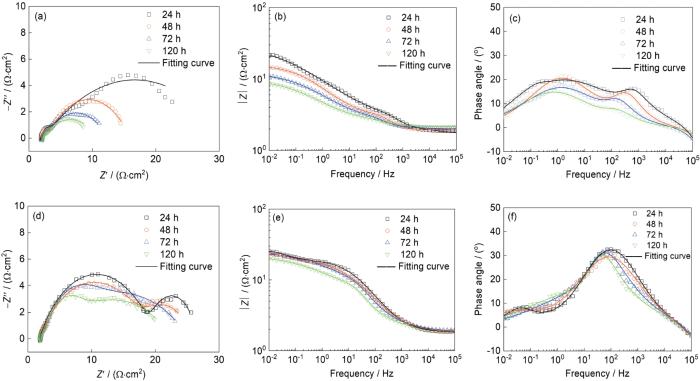 Electrochemical impedance spectroscopy (EIS) results for T8 steel (a-c) and T1# steel (d-f) after immersion for different time