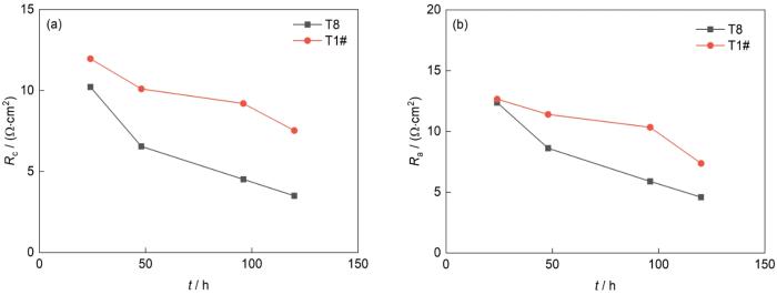 浸泡不同时间后T8钢和T1#钢的阴极反应电阻(Rc)和阳极反应电阻(Ra)