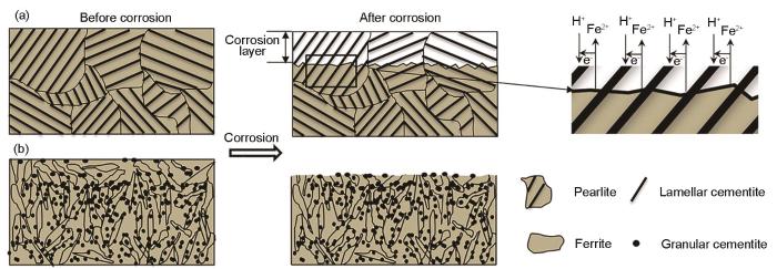 Schematics of corrosion mechanism for T8 steel (a) and T1# steel (b)
