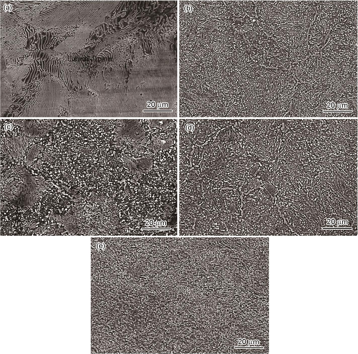 | Fig.4 SEM images of the original microstructure (a) and microstructures under different cooling conditions after deformation spheroidization (b-e) of T8 steel (b) T1# (c) T2# (d) T3# (e) T4# |
