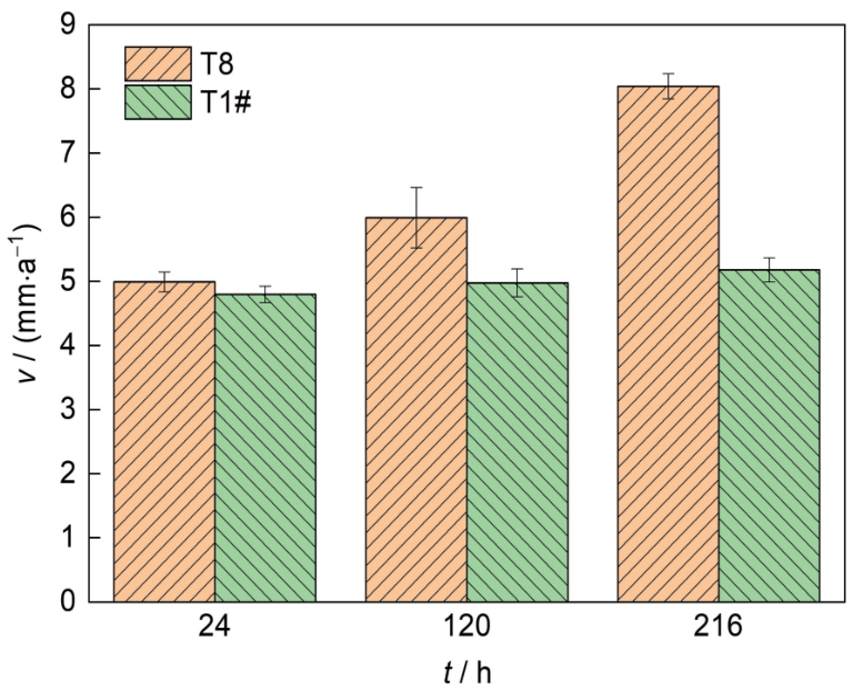 | 图13 T8钢和T1#钢在模拟溶液中的年腐蚀速率随浸泡时间的变化 |
