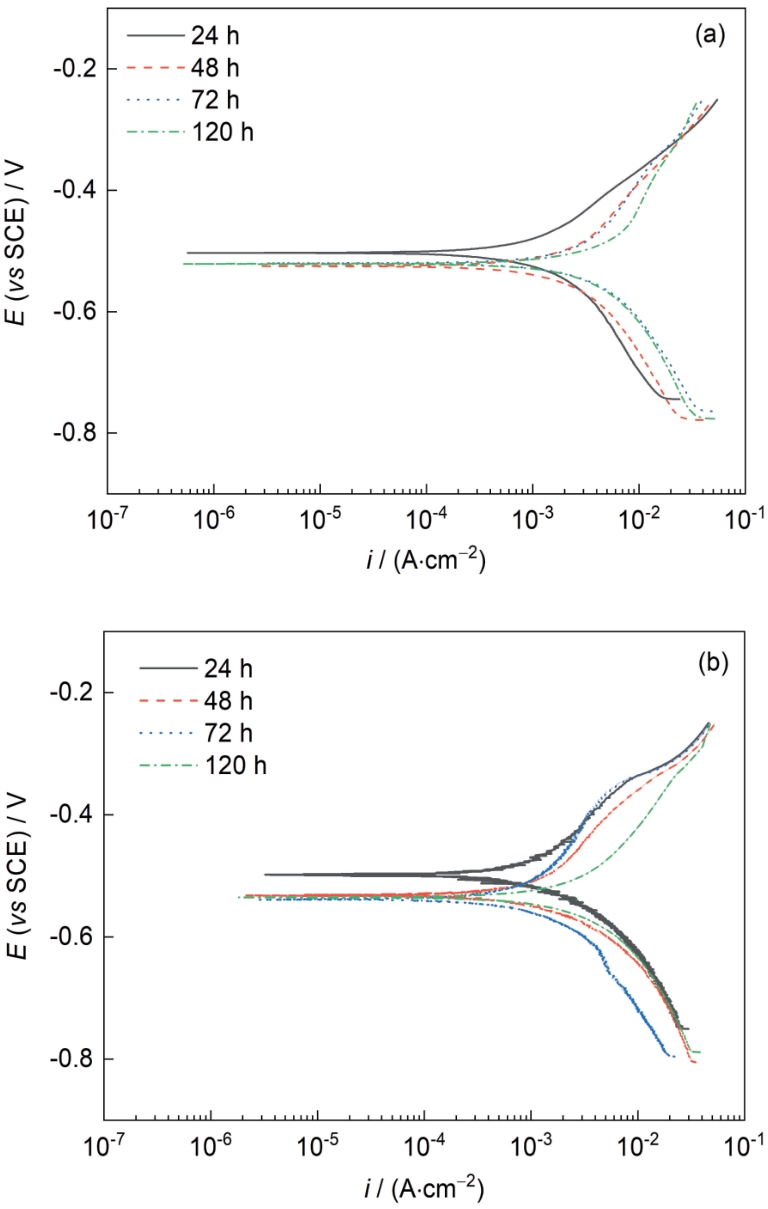 | Fig.14 Potentiodynamic polarization curves of T8 steel (a) and T1# steel (b) after immersion for different time (E—potential, i—current density, SCE—saturated calomel electrode) |