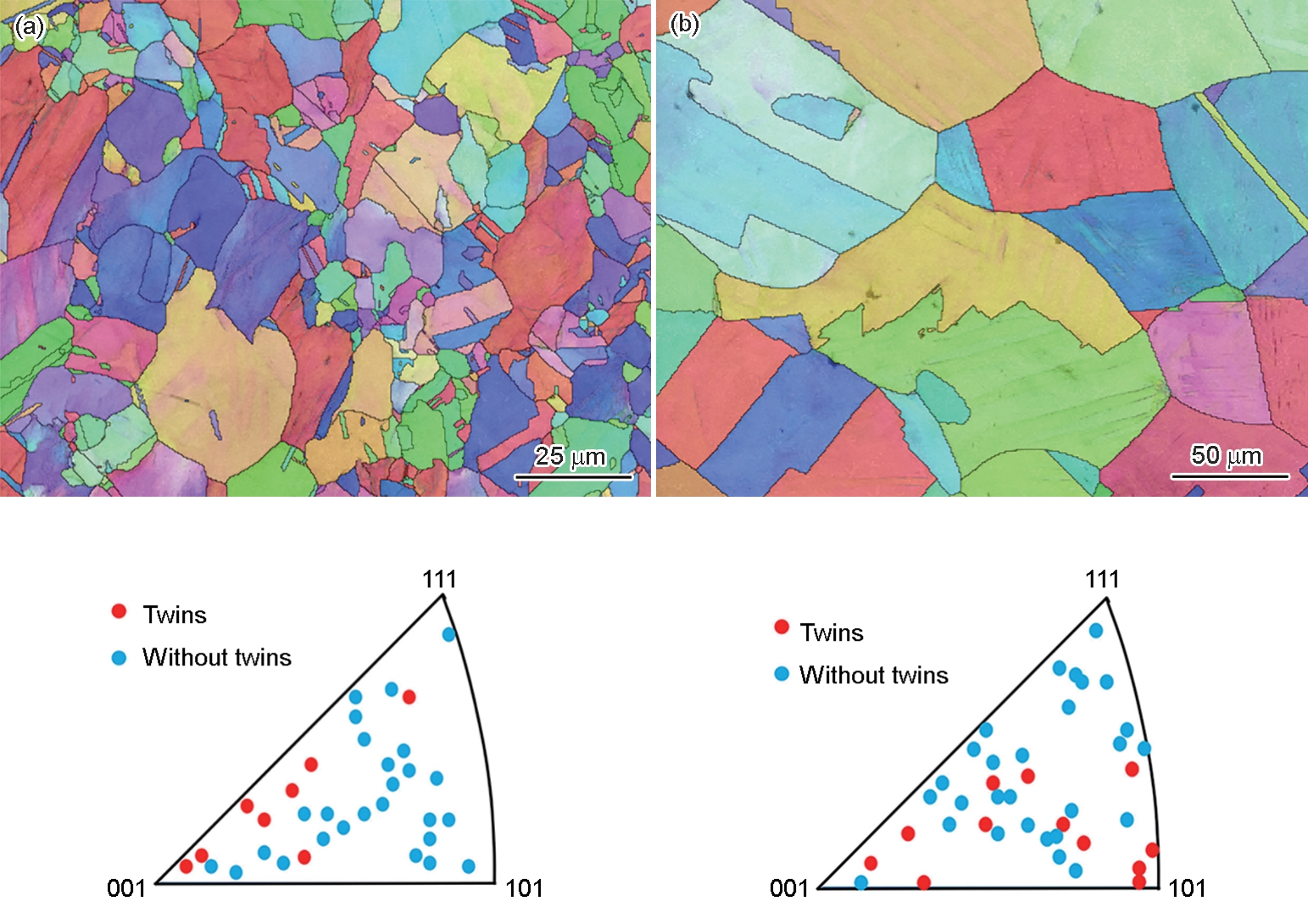 | Fig.9 Orientation maps showing the distribution of deformation twins (clusters) in Fe-22Mn-3Al-0.6C TWIP steels with grain sizes of 8 μm (a) and 60 μm (b) after cyclic loading with total strain amplitude of 1.0% |