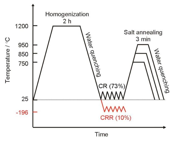 Schematic of processing routes for the high nitrogen austenitic stainless steel (HNASS) hot-rolled plate (CR—cold rolling, CRR—cryogenic rolling)