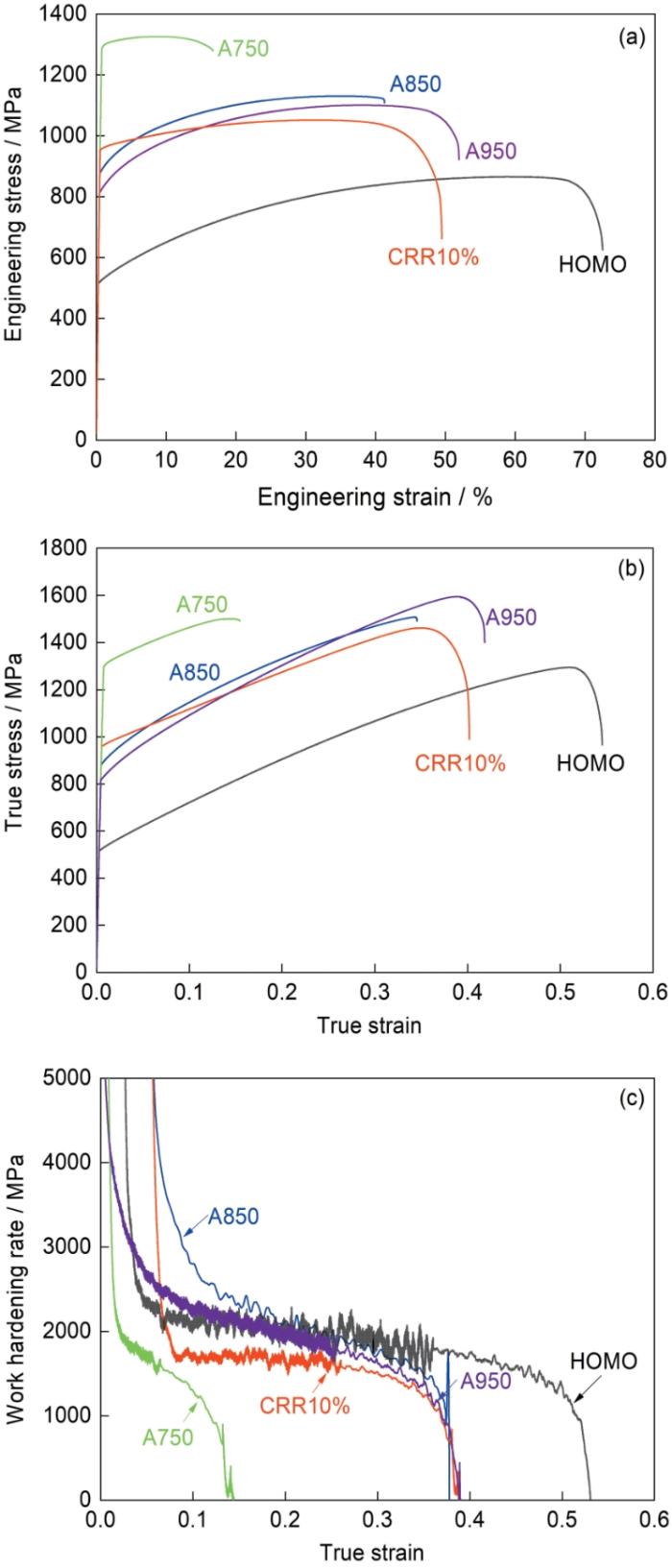 Egineering stress-strain curves (a), true stress-strain curves (b), work hardening rate vs true strain curves (c) of the A750, A850, A950, HOMO, and CRR10% materials at various states