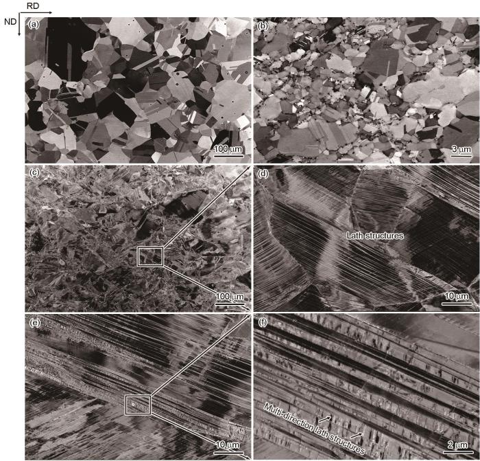 本工作将试样坐标系定义为由3个正交方向构成,分别是材料轧板的轧制方向(RD)、横向(TD)和法向(ND)。其中SEM试样取自轧板的侧轧面(即RD-ND平面),XRD、TEM和中子衍射试样取自轧板的轧面(即RD-TD平面)。