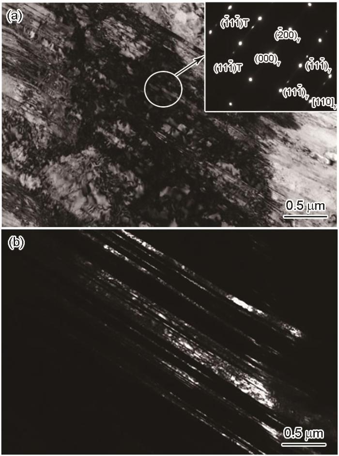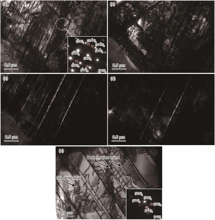 (a) bright-field TEM image and SAED pattern (inset) (b-d) dark-field TEM images of the fcc austenitic matrix (b), hcp ε-martensite laths (c), and fcc deformation twins (d) corresponding to Fig.4a (e) deformation twins and stacking faults, and the corresponding SAED pattern (inset)