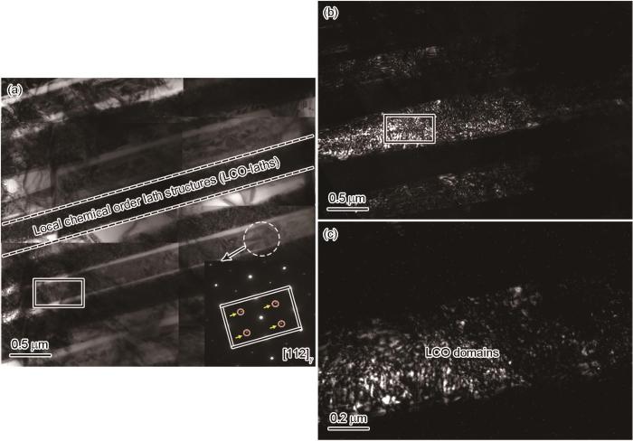 拉伸变形前CRR10%材料内部局部化学有序(LCO)板条的TEM像及SAED花样