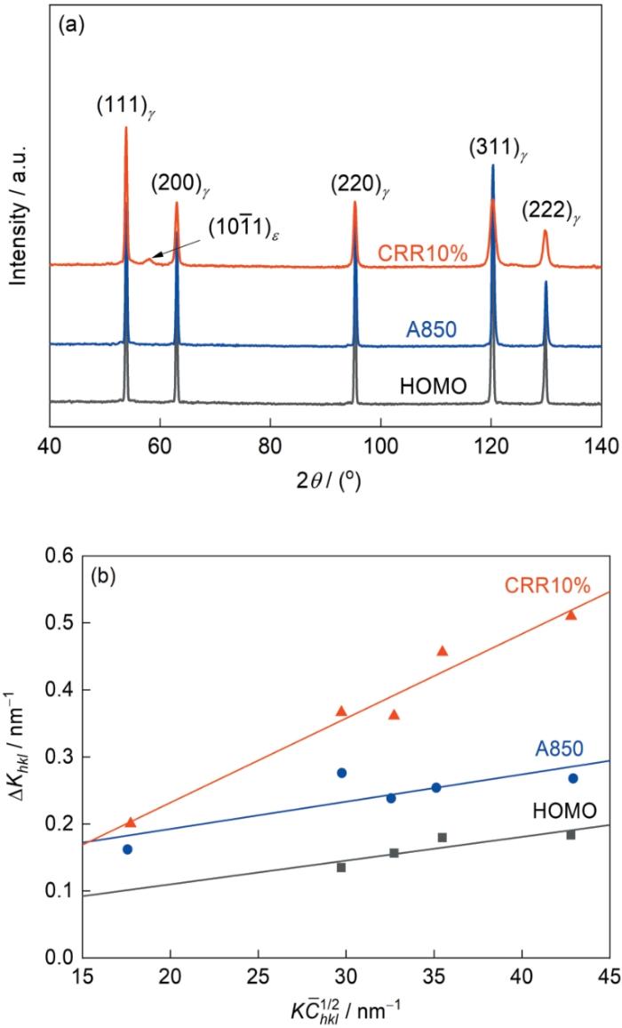 Neutron diffraction spectra (a) and modified Williamson-Hall (MWH) curves (b) of the HOMO, A850, and CRR10% materials (K = 2sinθ / λ,ΔKhkl = 2cosθ(Δθ) / λ, λ—waverlength, Δθ—full width of half maximum,C̅hkl —average dislocation contrast factor)