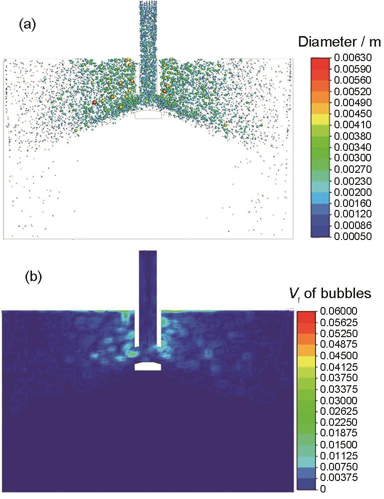 | Fig.7 Distribution of Ar bubbles (a) and gas volume fraction (b) of the mold (The casting speed is 1.4 m/min, the Ar blowing rate is 10 L/min, the nozzle angle is -15°, and the nozzle immersion depth is 180 mm. Vf—volume fraction) |