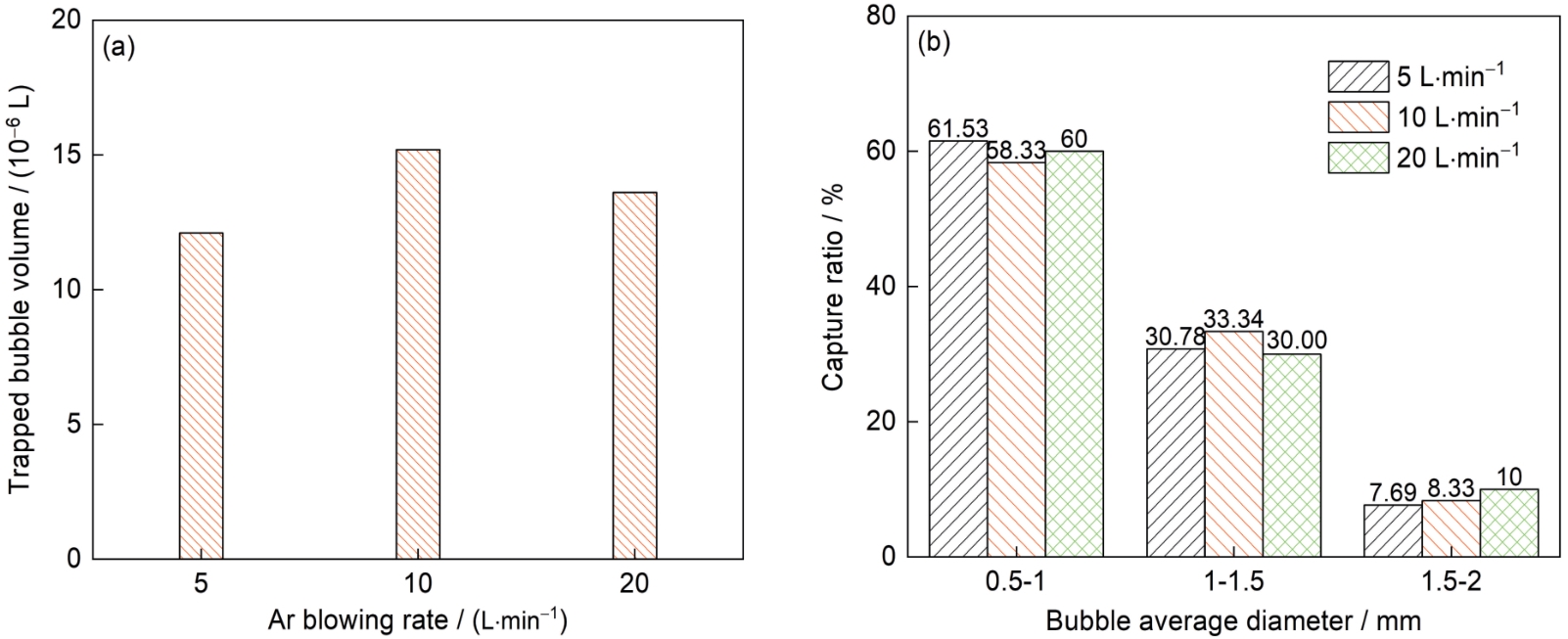 | Fig.15 Trapped bubble volumes (a) and capture ratios of bubbles with different diameters (b) of the mold with different Ar blowing rates |