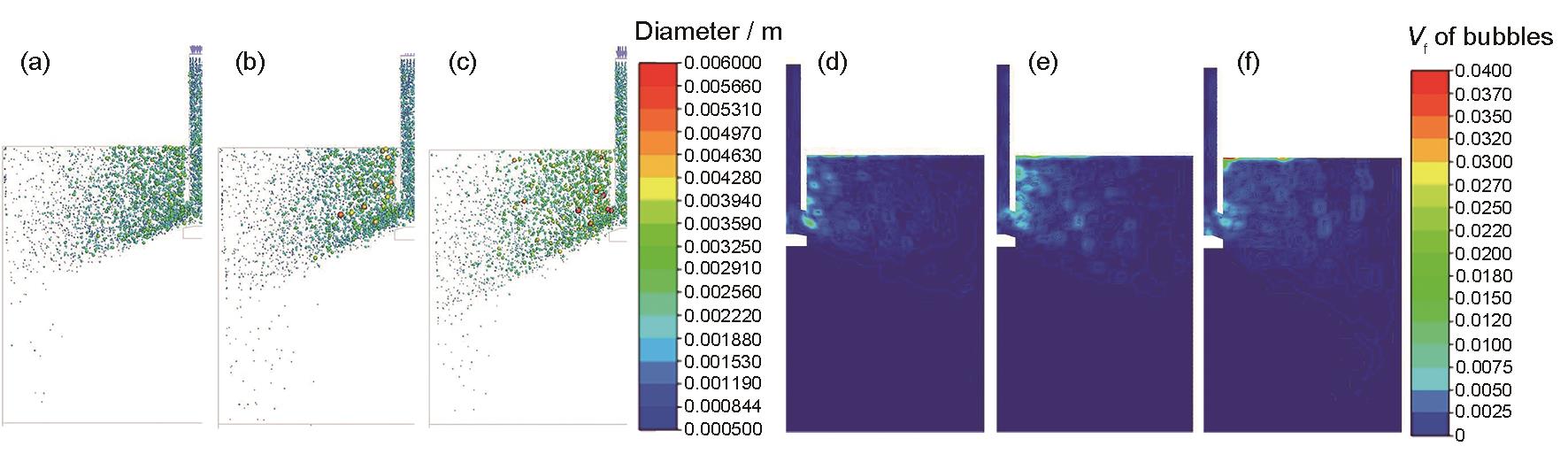 | Fig.16 Distributions of bubbles (a-c) and gas volume fractions (d-f) of the mold with different nozzle angles (The casting speed is 1.4 m/min, the nozzle angle is 15°, and the nozzle immesion depth is 180 mm) (a, d) -10° (b, e) -15° (c, f) -20° |