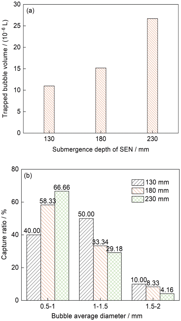 | Fig.21 Trapped bubble volumes (a) and capture ratios of bubbles with different diameters (b) in the mold with different nozzle immersion depths |