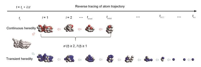 Schematics of continuous and transient heredities of fcc single crystal cluster cores, in which red and blue balls represent continuously and transiently inheritable atoms, respectively (t is the isothermal crystallization time; t0 is a designated moment for the reverse tracing of atom trajectories; Δt is the time interval; i = 1, 2, 3, … is recorded step number; tfcc and tSCC are the initial moments of transient heredity of fcc atoms and fcc single crystal cores, respectively; tinitial represents the initial moment of continuous heredity; tonset denotes the onset moment of nucleation corresponding to a critical nucleus; nc(t) and lc(t) are the quantity of continuously inheritable fcc atoms and the number of intercross-sharing (IS) linkages among continuously heritable fcc atoms in fcc single crystal clusters, respectively)