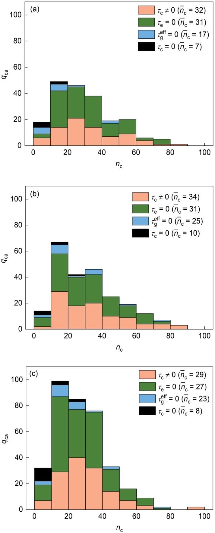 nc and qca of critical nuclei formed by different modes in Al droplet core (a), Al droplet shell (b), and Al bulk (c) (τc—nucleation incubation time)