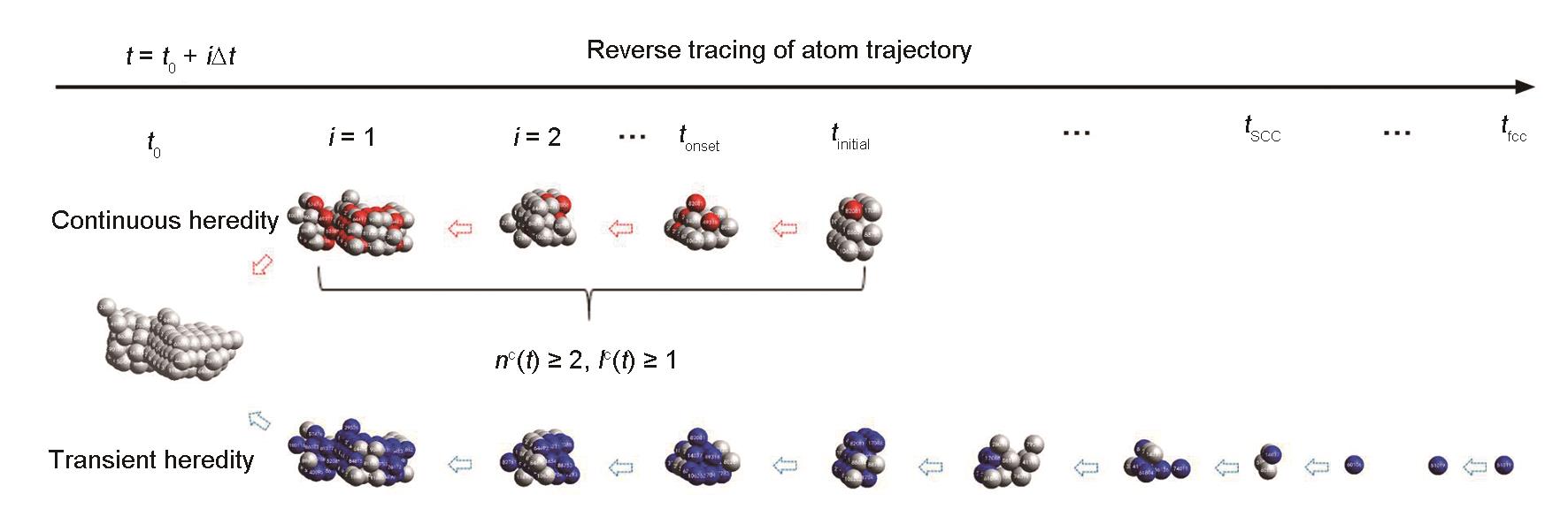 | 图1 fcc单晶团簇连续遗传和瞬态遗传示意图 |