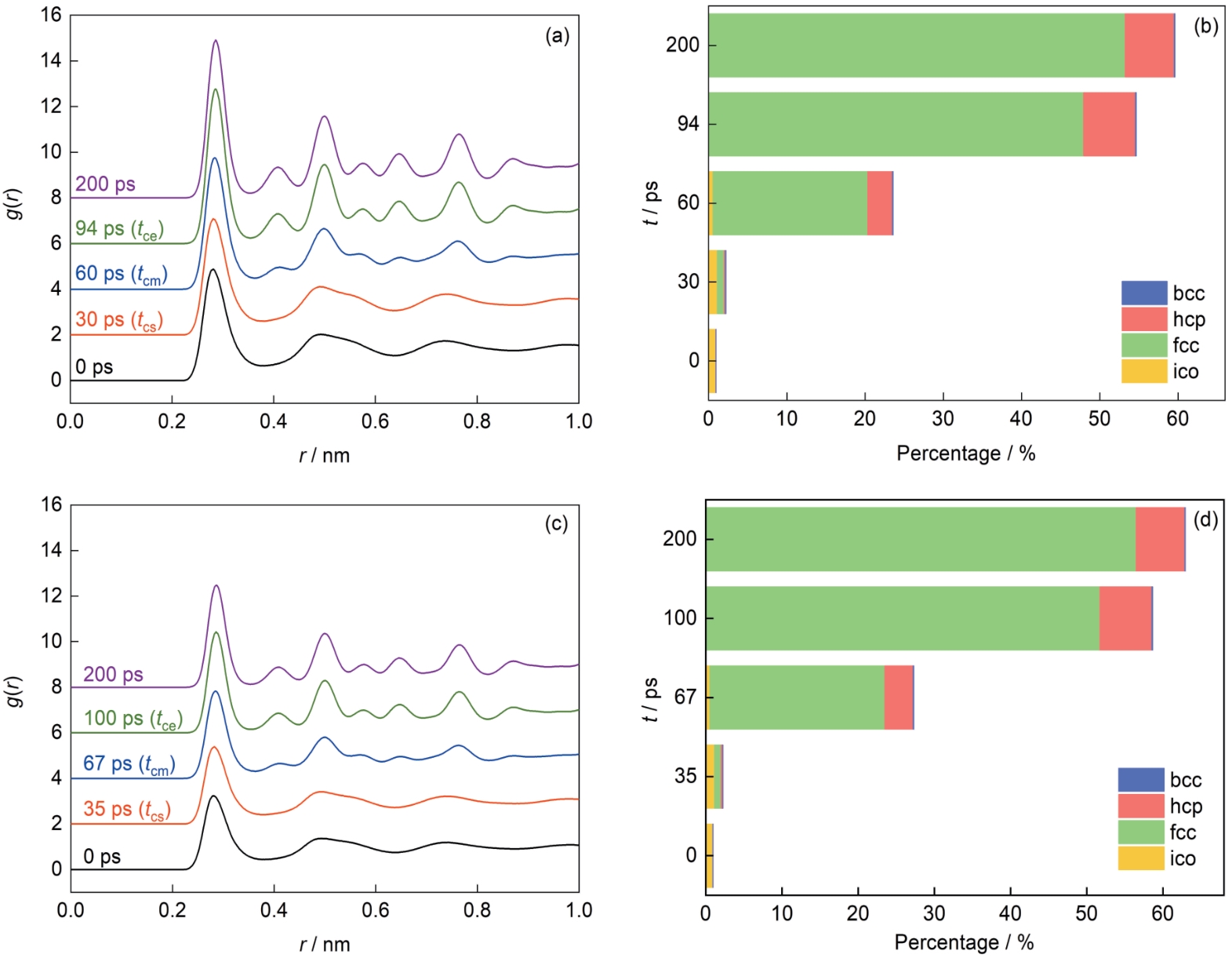 | Fig.3 Pair distribution function (g(r)) curves (a, c) and percentages of fcc, hcp, bcc, and ico atoms (b, d) during the isothermal crystallization of Al droplet (a, b) and Al bulk (c, d) (r—distance from the central atom. fcc, hcp, bcc, and ico represent faced-centered cubic, hexagonal close-packed, body-centered cubic, and icosahedral, respectively) |