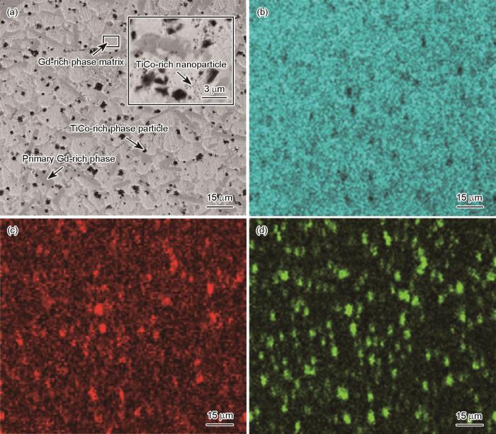 直径为445 μm的Gd-2%Co-2%Ti合金样品心部显微组织的SEM像和元素面分布图