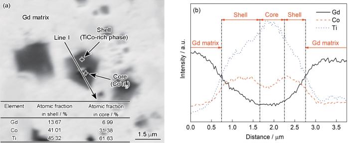 SEM image of shell/core TiCo-rich particle and the EDS point scanning results (inset) for the shell and core (a) and element line scanning results for Gd, Co, and Ti along line I in Fig.3a (b) of the Gd-2%Co-2%Ti alloy sample with a diameter of 445 μm (Shell and core represent the outer shell and inner core of TiCo-rich particle, respectively)