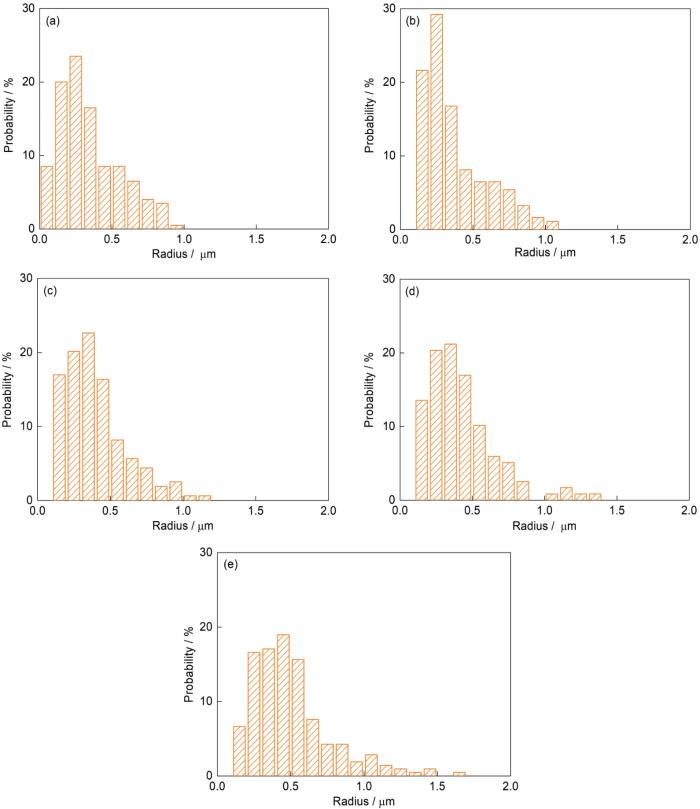 2D size distributions of the TiCo-rich particles in the Gd-2%Co-2%Ti alloy samples with diameters of 285 μm (a), 355 μm (b), 420 μm (c), 445 μm (d), and 710 μm (e)