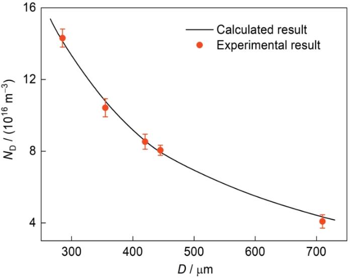 Gd-2%Co-2%Ti合金样品中富TiCo相粒子的数密度(ND)随样品尺寸(D)的变化