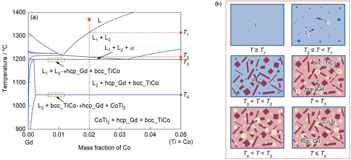Verical section of wCo∶wTi = 1∶1 for the phase diagram of the Gd-Co-Ti system (a) and schematic of the solidification process of the Gd-2%Co-2%Ti alloy under equilibrium conditions (b) (wCo and wTi—mass fractions of solutes Co and Ti, respectively. L1 + L2 represents liquid-liquid phase transformation region. T—temperature. T1, T2, T3, and T4 represent the equilibrium binodal line temperature, onset temperature of liquid-liquid-solid phase transformation, and temperatures of the invariant reactions 1 and 2, respectively)
