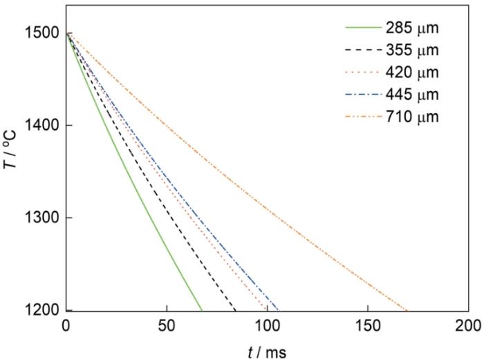 不同尺寸Gd-2%Co-2%Ti合金样品心部温度随时间(t)的变化