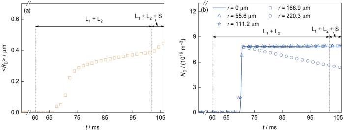 Average radius (<RD>) of the TiCo-rich droplets at the center region (a) and ND of the TiCo-rich droplets at different positions (r) from the center (b) of the alloy sample with a diameter of 445 μm as a function of t (L1 + L2 + S represents liquid-liquid-solid three-phase region)