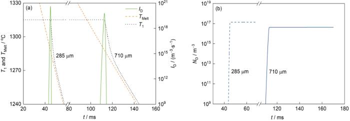 T1, melt temperature (TMelt), ID (a) and ND (b) of the TiCo-rich droplets at the center region of the Gd-2%Co-2%Ti alloy samples with diameters of 285 and 710 μm as a function of t