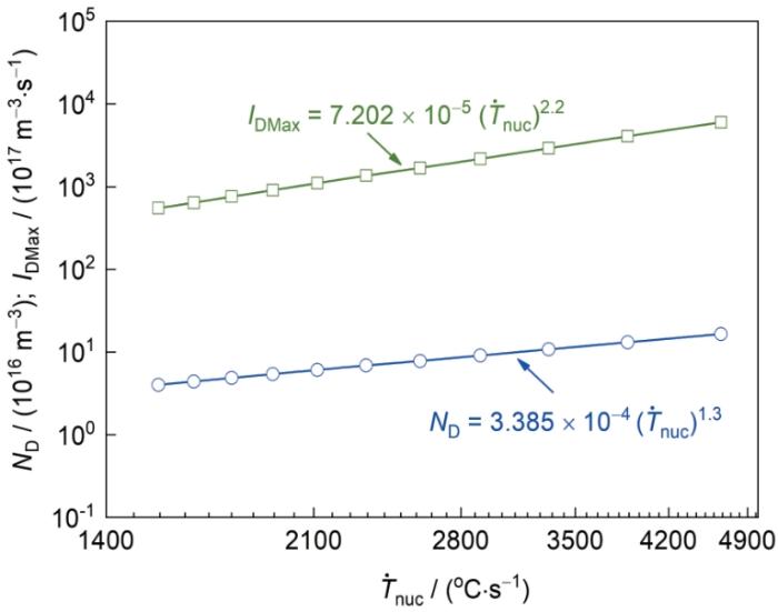 Gd-2%Co-2%Ti合金样品心部富TiCo相液滴的最大形核率(IDMax)和凝固后富TiCo相粒子ND随形核阶段冷却速率(