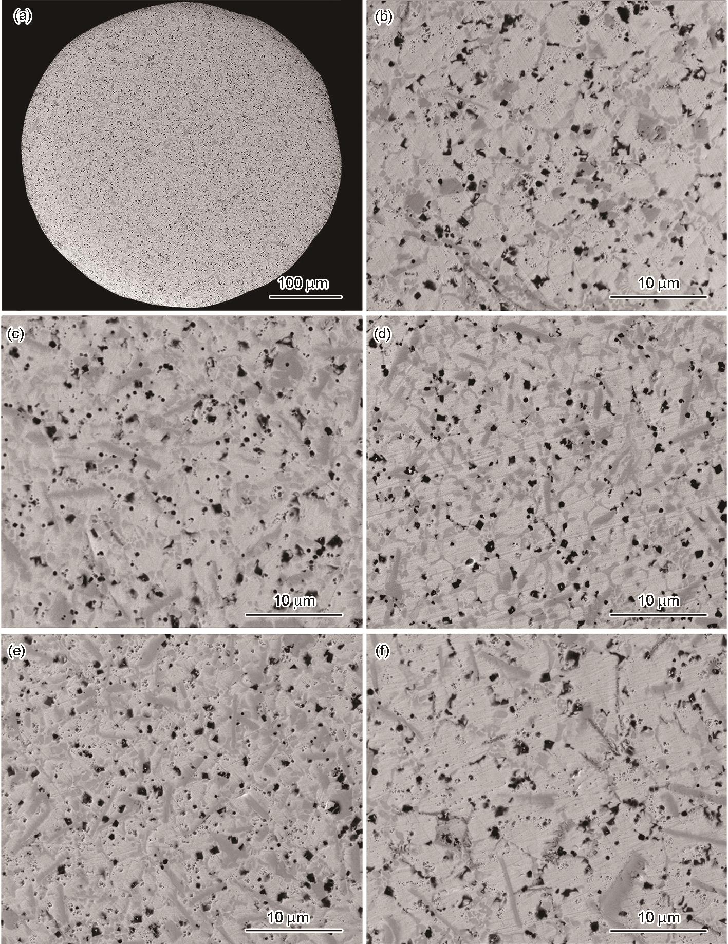 | Fig.1 Macromorphology of Gd-2%Co-2%Ti alloy sample (a) and SEM images showing the microstructures at the center region of the samples with diameters of 285 μm (b), 355 μm (c), 420 μm (d), 445 μm (e), and 710 μm (f) |
