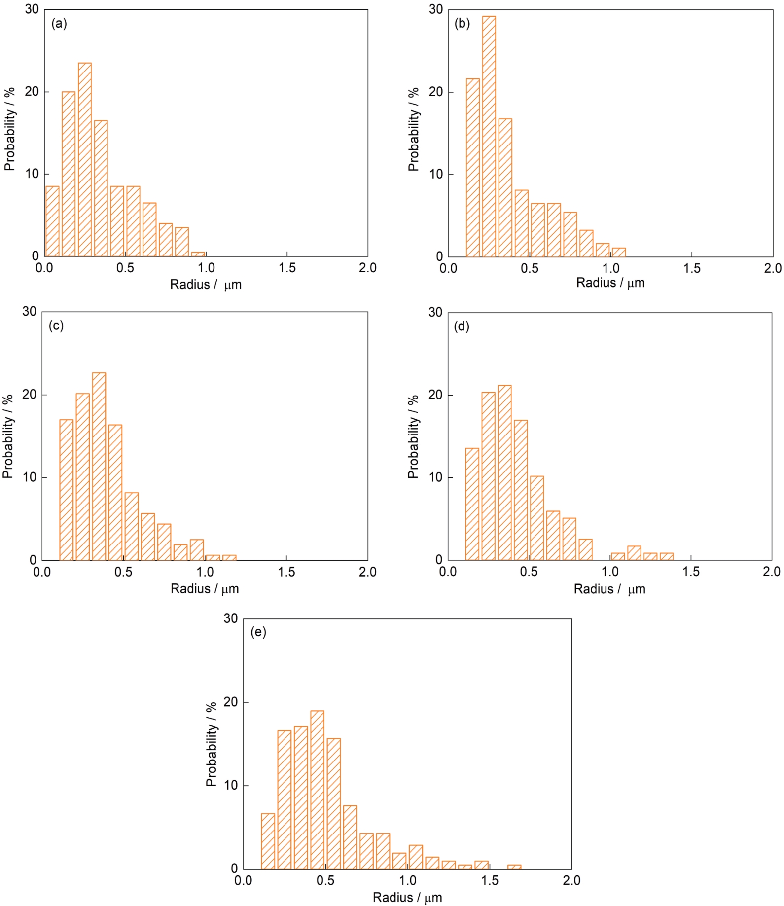 | Fig.4 2D size distributions of the TiCo-rich particles in the Gd-2%Co-2%Ti alloy samples with diameters of 285 μm (a), 355 μm (b), 420 μm (c), 445 μm (d), and 710 μm (e) |