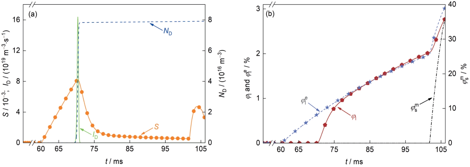 | Fig.8 Supersaturation of the matrix liquid (S), nucleation rate (ID) and number density (ND) of the TiCo-rich droplets (a), equilibrium volume fraction (φ |