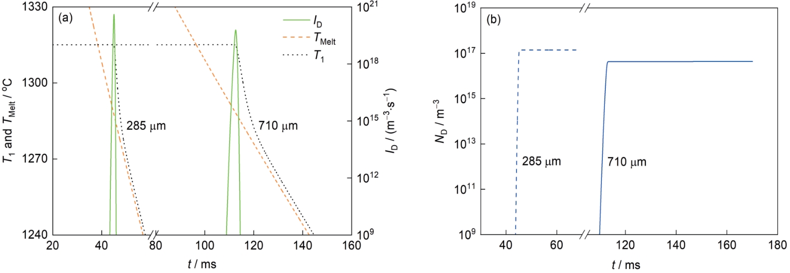 | Fig.10 T1, melt temperature (TMelt), ID (a) and ND (b) of the TiCo-rich droplets at the center region of the Gd-2%Co-2%Ti alloy samples with diameters of 285 and 710 μm as a function of t |