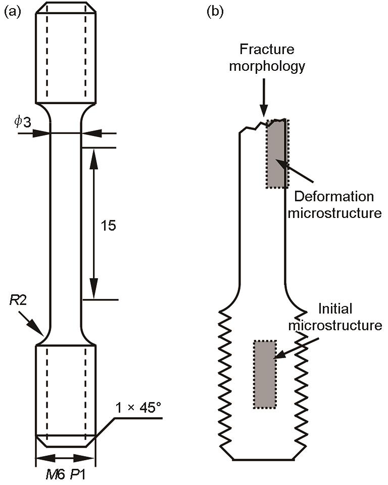| Fig.1 Schematics of dimension of tensile specimen (unit: mm) (a) and locations of microstructure and morphology observations for tensile fractured specimen (b) |