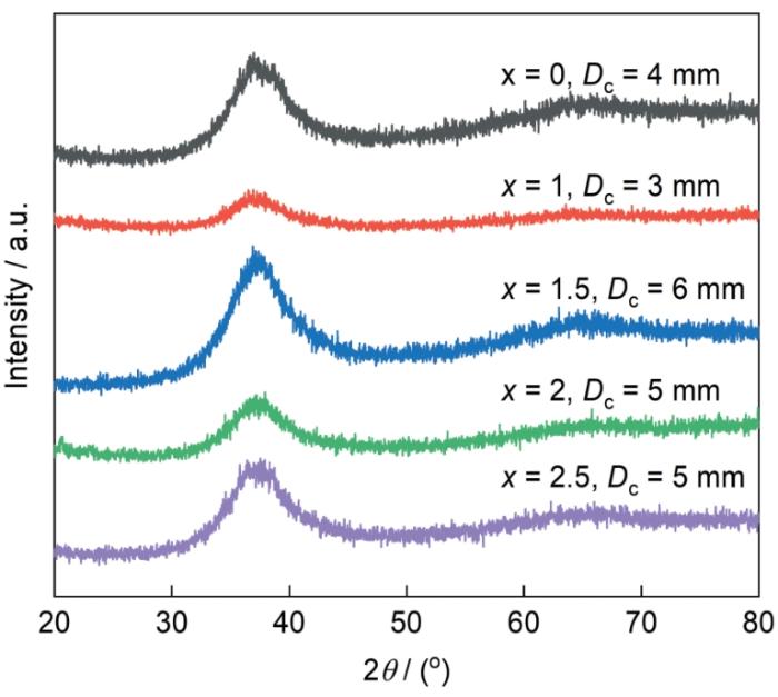 铸态Zr55Ti3Cu32 - x Al10Ag x 非晶合金临界尺寸的XRD谱