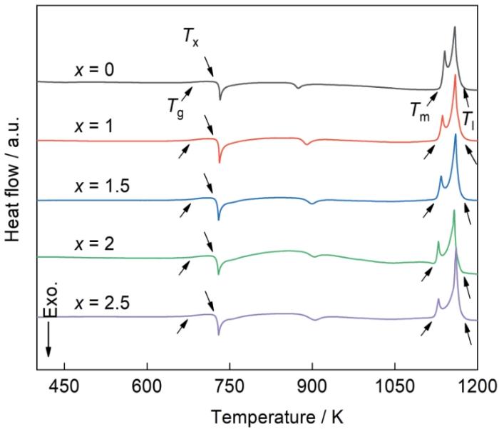 图2为Zr55Ti3Cu32 - x Al10Ag x 合金在20 K/min加热速率时的DSC曲线。该合金的玻璃转变温度(Tg)、晶化温度(Tx)、熔点(Tm)、液相线温度(Tl)如表1所示。可以看出,随着温度的增加,所有试样先是出现明显的玻璃化转变和过冷液体吸热事件,DSC曲线中的2个放热峰表明试样在加热过程发生两段晶化事件并析出2个不同的相。温度继续升高以后出现了2个吸热峰,此时2个结晶相在不同阶段开始熔化。基于热力学和动力学理论,目前使用最广泛的表征不同块体非晶合金玻璃形成能力的准则主要是约化玻璃转变温度Trg (Trg = Tg / Tl)[26,27],该参数同样列于表1。可以看出,随着Ag的添加,合金的Tg先增加再减小,当替换的Ag含量为1.5%时Tg最高,为673.8 K,合金的熔点和液相线都随着Ag的增加而降低,表明体系更趋于深共晶成分[19]。Trg随Ag含量的增加先减小后增大再减小,变化趋势与Tg和Dc具有相似规律,且当Ag添加量为1.5%时,Trg达到最大值,这表明该体系的玻璃形成能力与Trg判据有着良好的相关性。