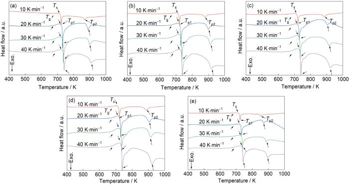 DSC curves of Zr55Ti3Cu32 - x Al10Ag x BMGs at different heating rates (Tp1, Tp2—the first and second crystallization peak temperatures, respectively)