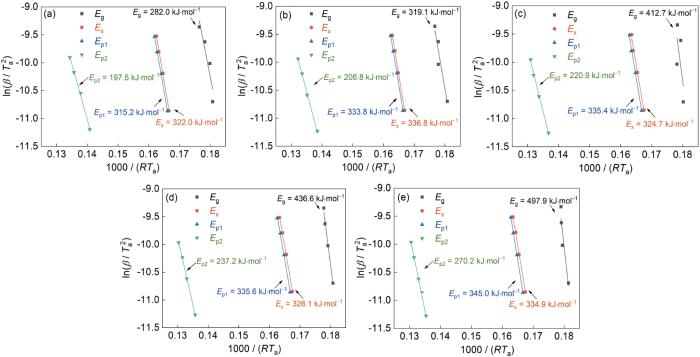 根据晶化动力学,非等温晶化过程中的玻璃转变表观活化能(Eg)、结晶成核活化能(Ex)、第一结晶峰和第二结晶峰的结晶生长活化能(Ep1、Ep2)可以用Kissinger方程[29]确定: