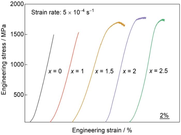 Compressive stress-strain curves of Zr55Ti3Cu32 - x-Al10Ag x BMGs under uniaxial compression with a diameter of 3 mm at room temperature