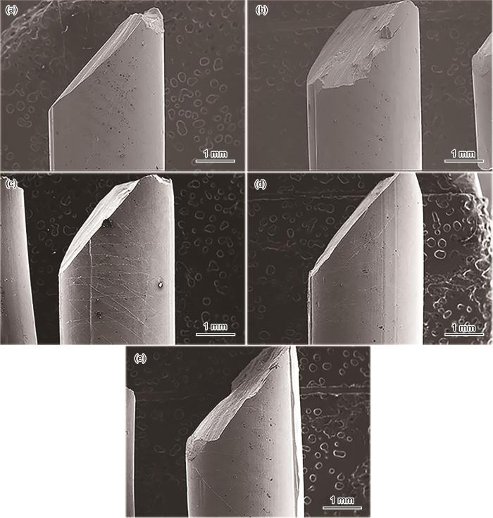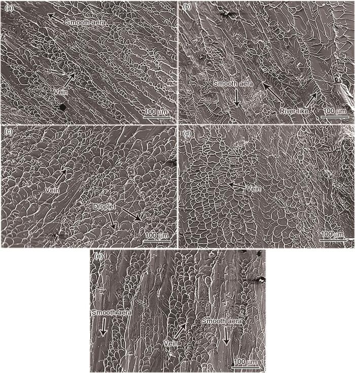 为进一步研究Zr55Ti3Cu32 - x Al10Ag x 非晶合金的断裂机制,对试样的断口截面和侧表面形貌进行观察,结果如图6和7所示。塑性较好的Zr55Ti3Cu32 - x Al10Ag x (x = 1.5和2)合金断面上分布着密集的脉络状花纹并伴有熔滴出现。这种形貌是应力加载过程中产生的,剪切带积累了很高的弹性能,在断裂前弹性能立即释放。由于局部产生加热导致断裂面温度迅速升高,使得玻璃软化从而形成脉状图案[31]。而Zr55Ti3Cu32 - x Al10Ag x (x = 0、1和2.5)试样断口表面形貌则由脉络纹图案、间歇平滑区域和河流状图案所构成,多种断裂形貌共存,表明了变形的不均匀性。Conner等[32]认为,平滑区域是由裂纹快速扩展形成的;Kusy等[33]认为河流状图案由主流和支流构成,支流的方向反映了施加的局部应力,它们的起始点对应于裂纹的成核位置。Ag的添加改变了合金断口形貌,初始合金的断口形貌由脉络状花纹与少量的条形光滑区域共存,Zr55Ti3Cu32 - x Al10Ag x (x = 1)试样断口形貌转变成以河流花样为主并在其上分布着少量的脉络状花纹;随着Ag的继续添加,Zr55Ti3Cu32 - x Al10Ag x (x = 1.5和2)试样的断口主要由均匀而密集的脉状纹构成;当x = 2.5时,试样的断口由较宽的平滑区和均匀的脉络状花纹构成。块体非晶合金的塑性还取决于剪切带的密度[32,34]。从图7可以看出,Zr55Ti3Cu32 - x Al10Ag x (x = 0和1)试样中除最大剪切平面以外无明显剪切带。相比于其他合金,Zr55Ti3Cu32 - x Al10Ag x (x = 1.5)试样具有更加密集的剪切带,这些交错分布的主、次剪切带相互作用使得裂纹形核和扩展受到抑制,合金表现出良好的室温塑性[35]。随着Ag的继续添加,合金侧表面的剪切带数量减少,合金塑性下降。可见,断裂形貌的变化规律与合金的塑性变形能力变化一致。
