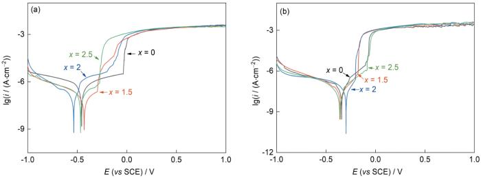 Zr55Ti3Cu32 - x Al10Ag x 非晶合金的在2种溶液中的动电位极化曲线