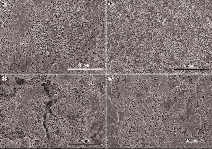 通过电化学腐蚀可得,Ag替换Cu使锆基非晶合金的耐生物腐蚀性能有所提高。为了进一步分析锆基非晶合金在PBS和SBF溶液中的腐蚀行为,采用SEM观察了极化后试样的腐蚀形貌。图9为原始合金与耐腐蚀性能最佳的Zr55Ti3Cu32 - x Al10Ag x 合金在PBS和SBF溶液中的腐蚀形貌。从图9a和b可以看出,经过PBS溶液电化学腐蚀后,初始合金基体完全被腐蚀,有点蚀坑出现,其周围为粗糙的腐蚀裂纹,基体松散且腐蚀严重;添加1.5%Ag时合金试样表面分布着密集的点蚀坑,但是未发生点蚀的区域平整无裂纹,未被腐蚀区域相对平整无龟裂。从图9c和d中可以看出,经过SBF溶液电化学腐蚀后,初始合金试样的腐蚀形貌中出现深裂纹,裂纹周围被完全腐蚀;而添加2%Ag时试样腐蚀形貌分布有点蚀坑但无深裂纹,点蚀坑周围的腐蚀程度较初始合金明显更浅。从腐蚀形貌可以看出,适量Ag的添加,能有效改善和提高锆基非晶合金的耐生物腐蚀性能。