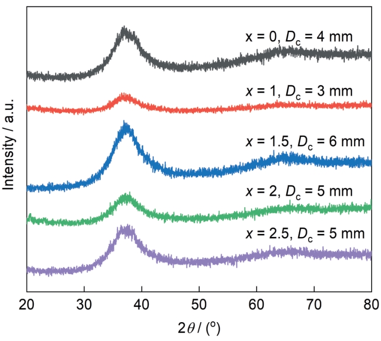 | Fig.1 XRD spectra of as-cast Zr55Ti3Cu32 - x Al10Ag x bulk metallic glasses (BMGs) with their critical diameters (Dc) |